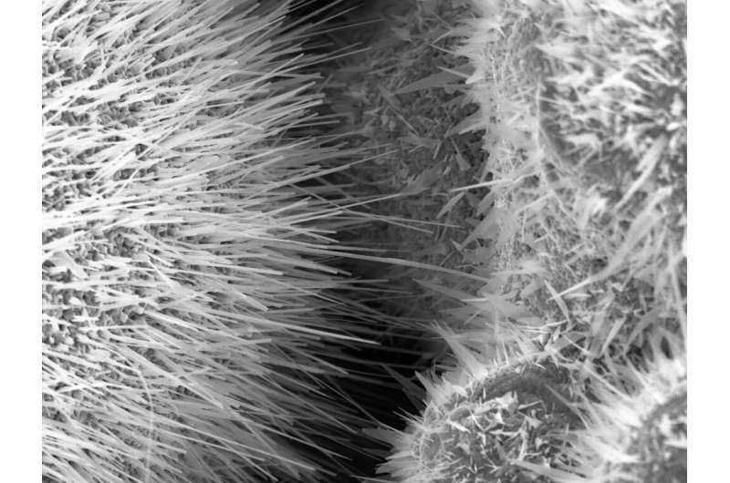 顯微鏡下的傳感器表面:研究小組從金屬微粒中生長出細(xì)小的線和尖峰,這些金屬微粒特別擅長捕獲氣體分子。