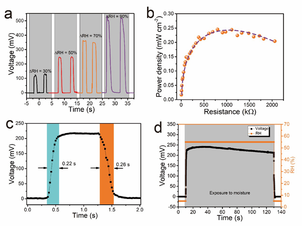 圖3. a. g-PDA柔性自供能器件在ΔRH分別為30%, 50%, 70%,和 90%時(shí)產(chǎn)生的開路電壓信號。b. g-PDA自供能器件在不同外接電阻下的有效輸出功率(ΔRH=90%)。c. g-PDA自供能器件對濕氣的響應(yīng)和恢復(fù)時(shí)間(ΔRH=50%)。d. g-PDA自供能器件在恒定ΔRH=50%條件下的開路電壓信號。