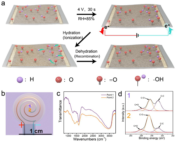 圖2. a. 高濕度環(huán)境下極化處理PDA示意圖。b. 極化后的g-PDA柔性自供能器件示意圖。1電極為施加極化電壓的陽極,2電極為陰極。c.靠近1和2電極區(qū)域的PDA薄膜紅外譜圖。d. 靠近1和2電極區(qū)域的PDA薄膜表面C元素高分辨XPS譜圖。