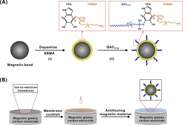 圖4.磁性雙功能納米材料的合成(A)及可更新式防污損傳感器的構建(B)示意圖