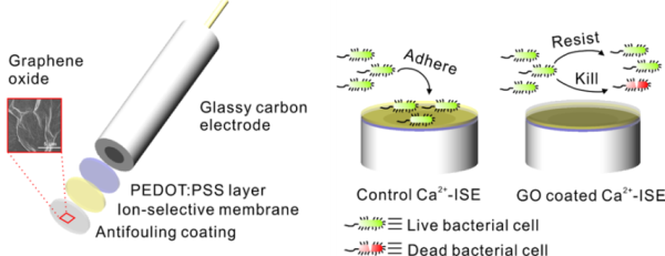 圖3.基于氧化石墨烯的聚合物敏感膜電位型傳感器的構建和防污原理示意圖