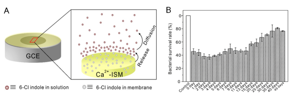 圖2.基于6-氯吲哚緩釋的防污損聚合物膜電位型傳感器的結構(A)和長期防污損效果(B)