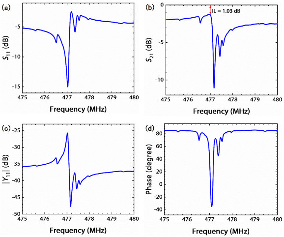 圖1. GaN SAW諧振器 (a) S11、(b) S21曲線及導(dǎo)納的 (c) 幅度、(d) 相位曲線。