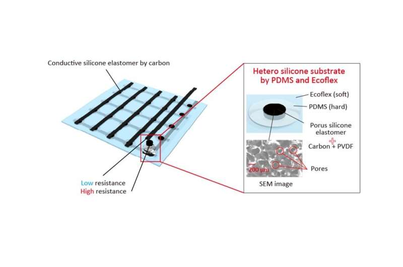 陣列示意圖。這種有機硅基材由兩種具有不同硬度值的硅膠類型制成。較硬的硅膠PDMS在壓力部分可以控制壓力傳感元件在拉伸過程中的變形。來源:橫濱國立大學(xué)太田弘樹