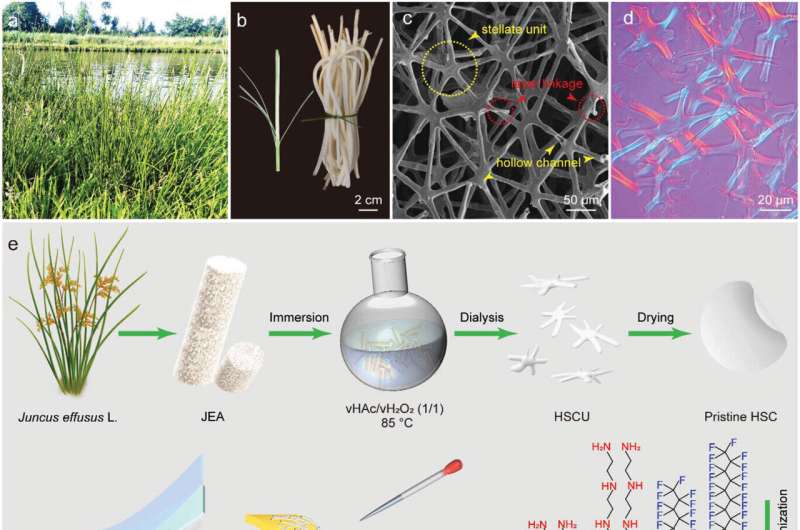 a)積液Juncus effusus L.(乙腦)b)提取乙腦通氣組織(JEA)泡沫。c) JEA網(wǎng)絡(luò)的SEM圖像。d)中空星狀纖維素單元(HSCU)的偏振光學(xué)顯微鏡圖像。e) HSC-TENG制備工藝及結(jié)構(gòu)示意圖。f) AgNWs電極的SEM圖像。g)原始中空星狀纖維素(PHSC)膜表面的SEM圖像。h)半透明可彎曲的PHSC。i)輕質(zhì)PHSC (3cm × 2cm, 19.86 mg)。學(xué)分:先進功能材料(2023)。DOI: 10.1002 / adfm.202304801