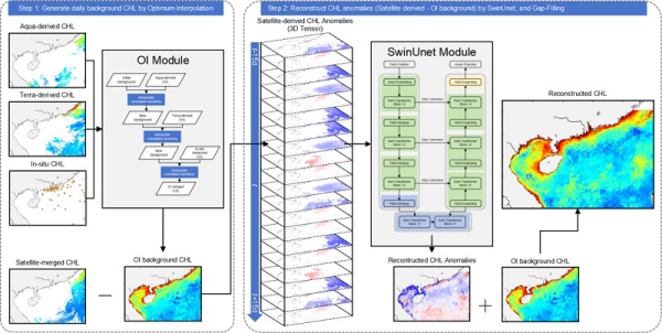 該研究結(jié)合最優(yōu)插值(OI)方法和深度學習網(wǎng)絡框架(SwinUnet),構(gòu)建了基于數(shù)據(jù)異常預期方差的深度學習模型——OI-SwinUnet。該方法利用最優(yōu)插值,基于空間鄰域信息,融合衛(wèi)星觀測和現(xiàn)場觀測數(shù)據(jù),并利用SwinUnet對大區(qū)域長時序的遙感觀測時間序列數(shù)據(jù)進行多尺度特征學習,重建缺失的葉綠素a濃度數(shù)據(jù),進而獲得南海區(qū)域逐日1km海表葉綠素產(chǎn)品。