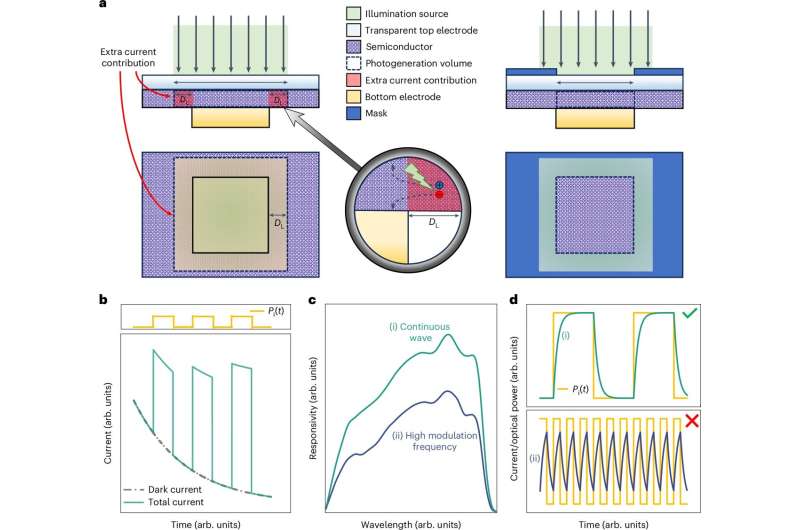 響應(yīng)度 / 外量子效率(EQE)表征面臨的挑戰(zhàn)。a 圖:左側(cè)為入射光束過填充現(xiàn)象,載流子產(chǎn)生區(qū)域超出標(biāo)稱活性區(qū)域,延伸至特征尺寸為 DL 的外圍區(qū)域,導(dǎo)致響應(yīng)度 / EQE 測定不準(zhǔn)確;右側(cè)為采用孔徑法實現(xiàn)響應(yīng)度 / EQE 的準(zhǔn)確測定。b 圖:在器件承受多束功率為 Pi (t) 的光脈沖期間,監(jiān)測隨時間變化的暗電流對準(zhǔn)確測量響應(yīng)度 / EQE 至關(guān)重要。c 圖:調(diào)制頻率選擇不當(dāng)對連續(xù)波光響應(yīng)度 / EQE 表征的調(diào)制測量結(jié)果產(chǎn)生影響。d 圖:c 圖所示效應(yīng)的時域示意圖,上方為合適的調(diào)制頻率,可通過調(diào)制測量準(zhǔn)確測定連續(xù)波光響應(yīng)度 / EQE;下方為不合適的調(diào)制頻率。來源:《自然光子學(xué)》(2025)。DOI:10.1038/s41566-025-01759-1