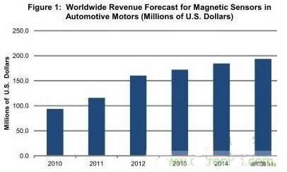 最新預計硅磁傳感器在汽車電機中的應用率將急增。由于能夠改善汽車安全性、便利性和燃油效率,硅磁傳感器在汽車電機中的應用將快速增長,該市場的銷售額將在2012年增長近40%。2012年汽車電機領域的磁傳感器銷售額將達到1.603億美元,延續(xù)最近三年的穩(wěn)健增長勢頭。盡管2012年以后銷售額增長速度將會放緩到一位數,但2010-2015年的復合年度增長率仍將達到16%。到2015年,汽車電機領域的磁傳感器銷售額將上升到1.936億美元。
