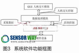 本系統(tǒng)由三大模塊組成,如圖3所示,從底層到上層分別是:數(shù)據(jù)采集驅(qū)動(dòng)模塊,數(shù)據(jù)處理模塊,GUI人機(jī)交互模塊。