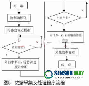 數(shù)據(jù)采集及處理部分的程序流程如圖5所示。其中檢測初始化包括檢測模塊上電,I/O控制端口初始化、加速度傳感器的初始化;加速度傳感器需要零點(diǎn)校準(zhǔn)和自檢測以滿足精度要求;系統(tǒng)調(diào)用檢測任務(wù)后,外部中斷打開,等待加速度傳感器的中斷上報(bào)及檢測數(shù)據(jù)采集。