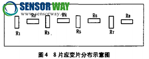 釆用8片應(yīng)變片組成應(yīng)變式測(cè)力傳感器,相比4片應(yīng)變片組成的電橋結(jié)構(gòu),可提高靈敏度1倍左右,還可以提髙傳感器測(cè)量的線性特性。