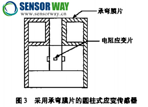 圖3所采用的結(jié)構(gòu)為在傳感器剛性外殼上端面加 一片極薄的膜片,由于膜片在平面方向剛度很大,所以 作用在膜片平面內(nèi)的橫向力就經(jīng)過膜片傳遞到外殼或 底座,在垂直于平面方向的膜片剛度很小,所以沿柱體 軸向的變形正比于被測(cè)力。這樣,膜片就承受了絕大部 分橫向力和彎曲,消除了對(duì)測(cè)量精度的影響。